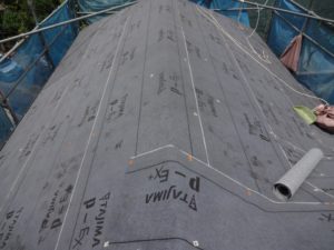 棟板金、雪止め解体後、防水シート(改質ゴムアスファルトルーフィング)を全面に張り上げていきます。
