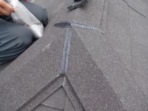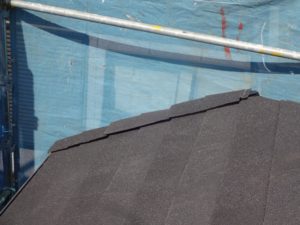 先ほどのタフモックに同質の棟カバーを取付けて、取合いにコーキングを塗っていきます。