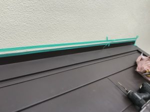 壁取り合いの雨押え役物の下地にタフモックを取付けていきます。