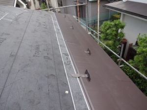 新規ガルバリウム鋼板(フッ素)の取付け後、棟板金の下地を取付けていきます。