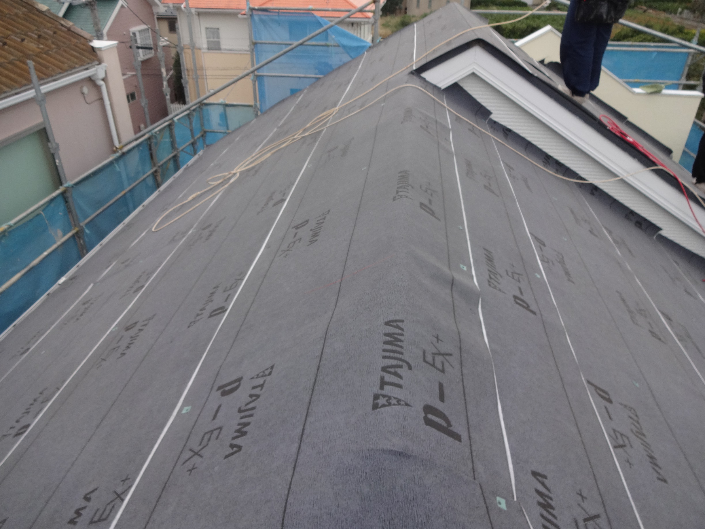 防水シートは、田島ルーフィングの「PカラーEX(改質アスファルトルーフィング)」を使用しています。