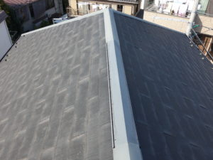 屋根材は「ニチハのパミール」が使用されており、状態が良くないため塗装で仕上げることが難しく、屋根にカバー(重ね葺き)を行っています。