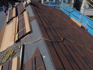 棟板金と雪止め金具の解体後に清掃を行い、防水シートを全面に張っていきます。