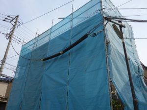 屋根工事を行う前に、仮設足場を設置して、「安全対策や養生」を行っていきます。