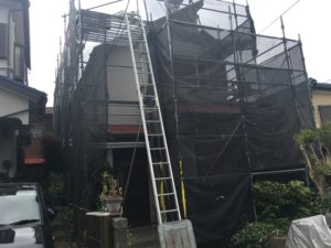 屋根工事作業前に、仮設足場の設置を行っていきます。