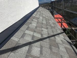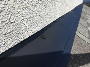外壁との取合い部分には、「雨押え板金」という役物を設置して、コーキングを打って仕上げていきます。