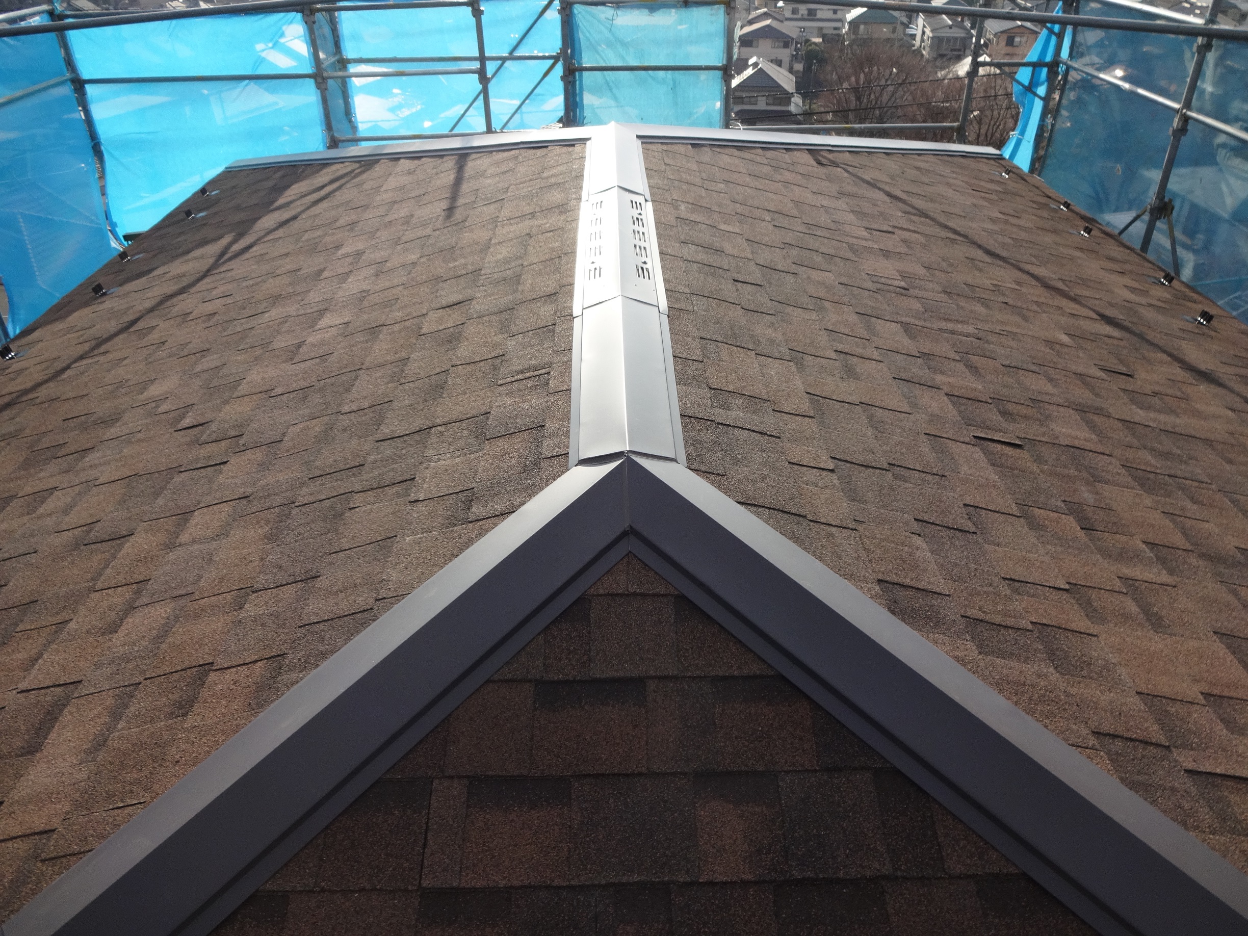 タフワイド張り後、新しい棟板金を取付けていきます。