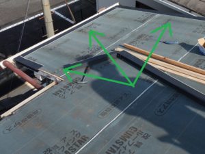 防水シートを張った後、軒先や端部に唐草板金(からくさ)を取付けていきます。