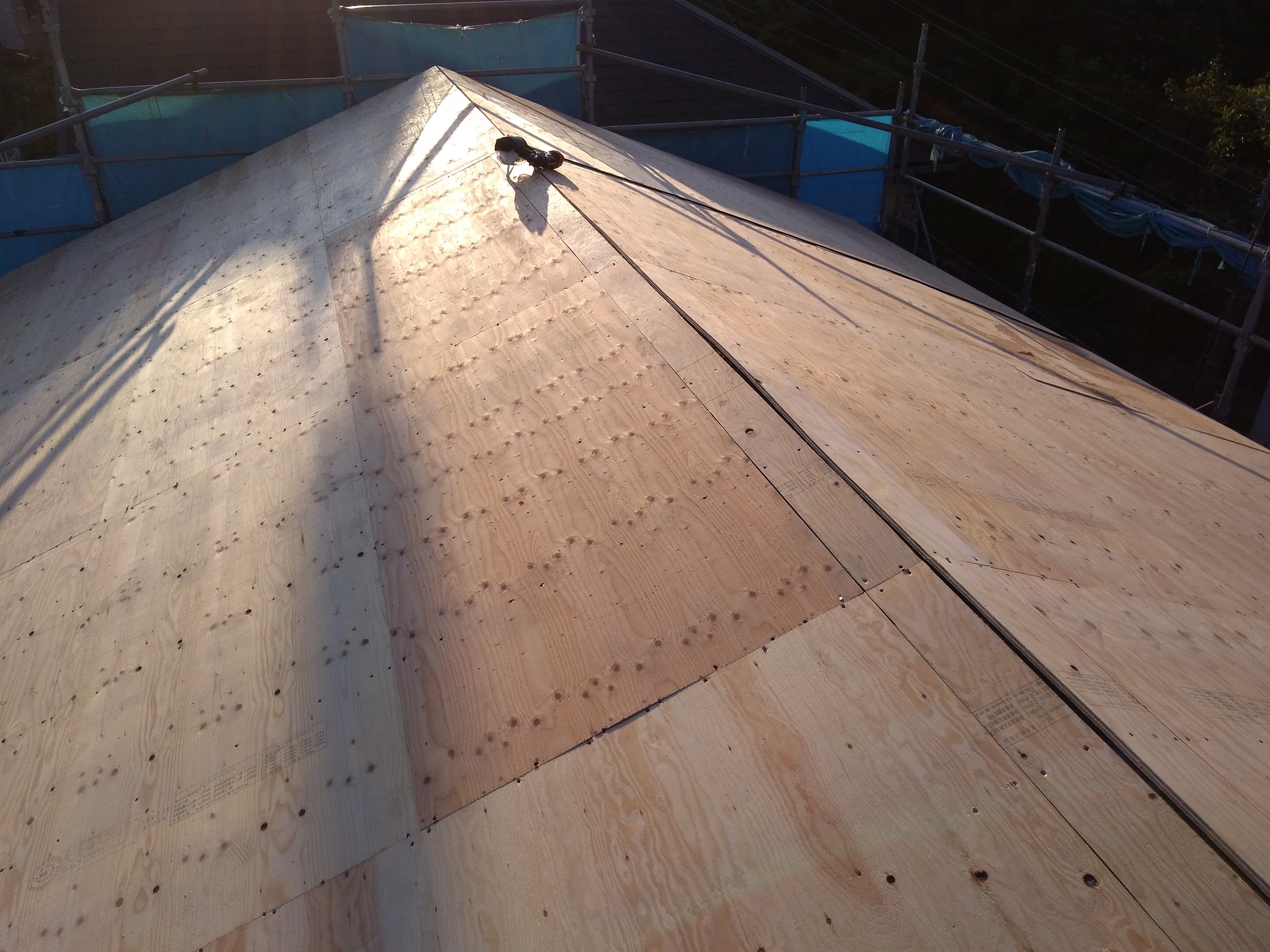 この野地板が施工された時点で、屋根の形状が仕上がります。